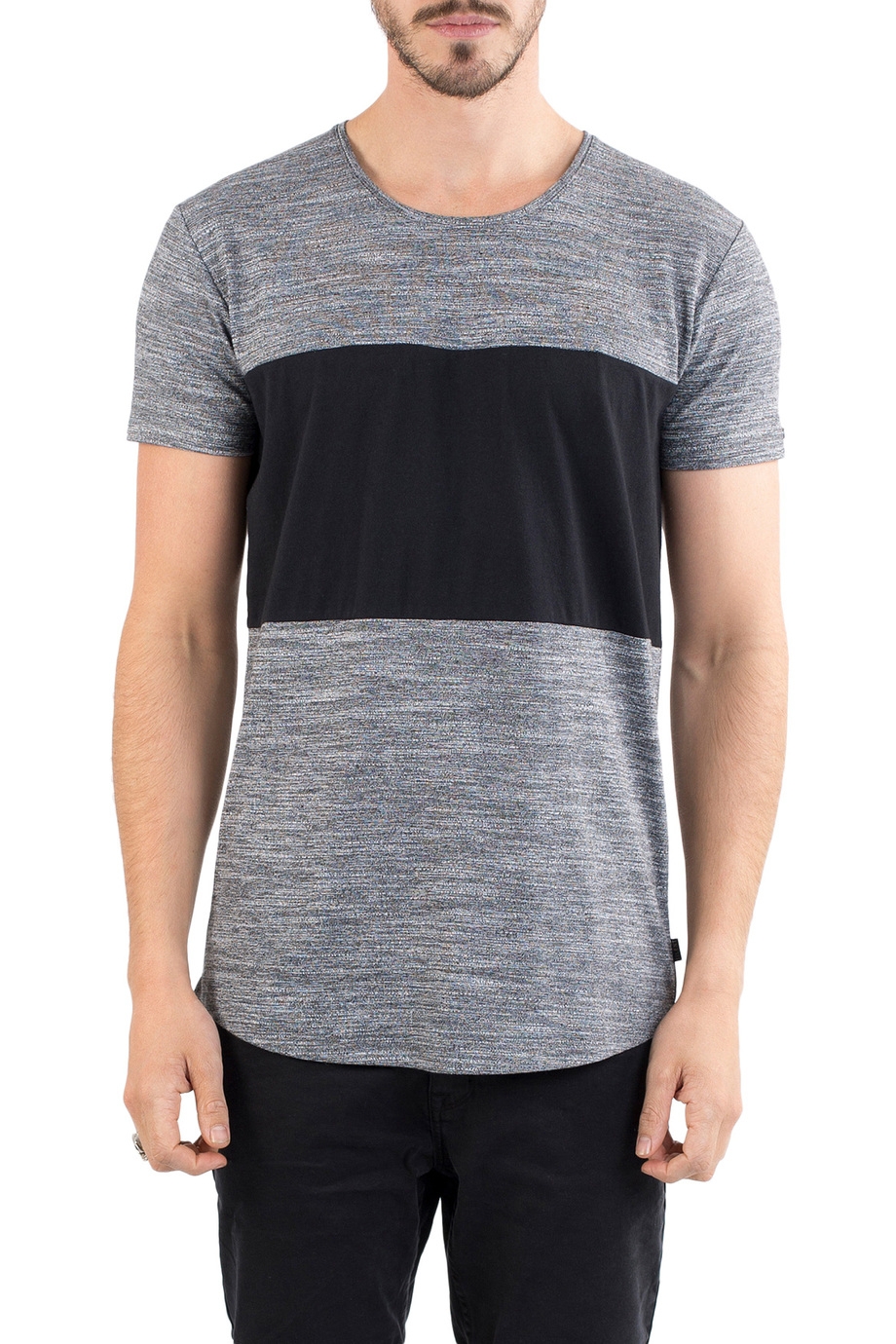 The tee has a crew neckline, short sleeves, scooped hemline and a contract colour chest panel.